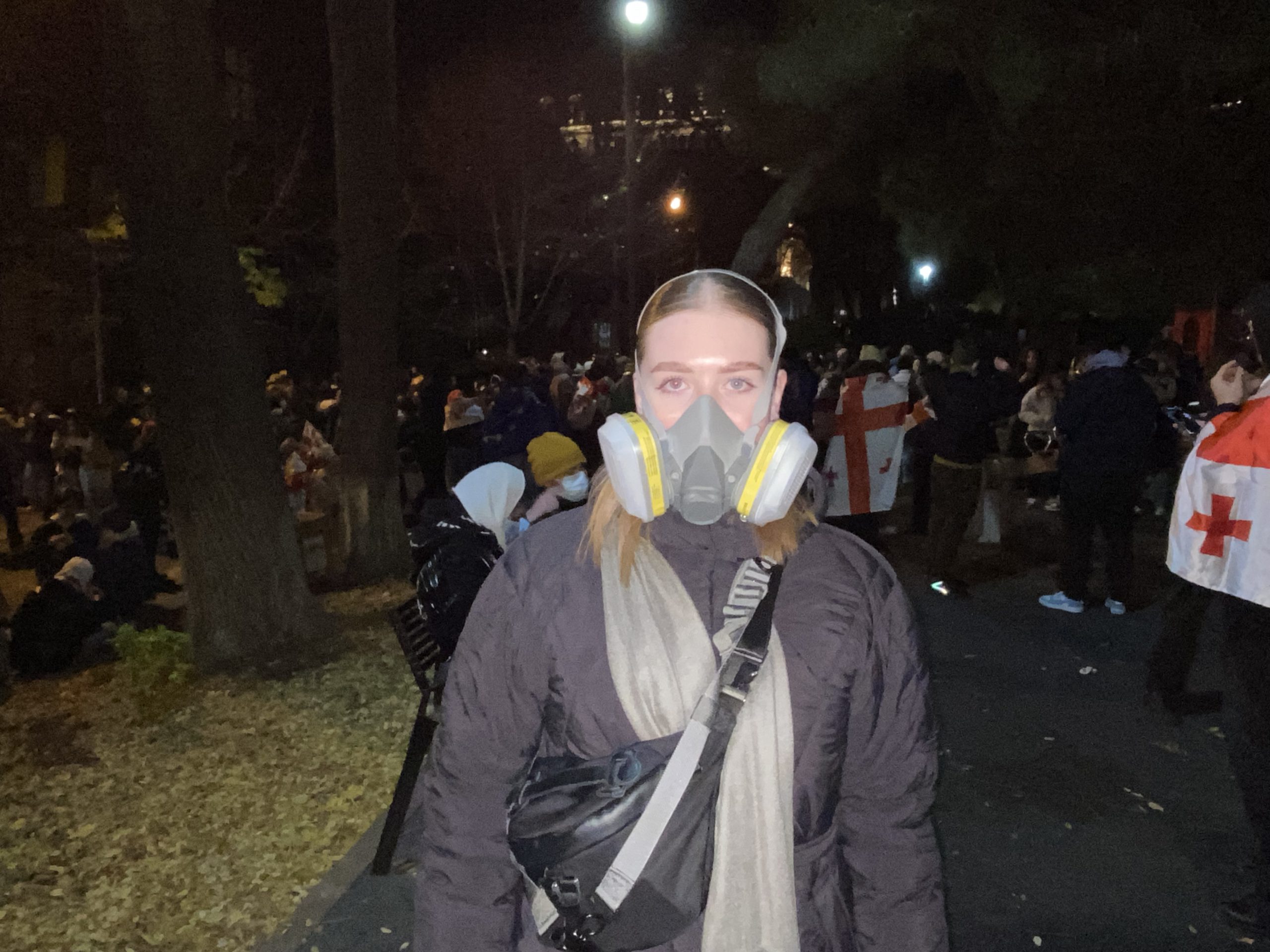 På Khazinagatan, en sidogata till Rustaveli Aveny där parlamentet ligger, står flera hundra människor vid en stor minibuss som just anlänt till platsen. Från minibussen tar man ut stora kartonger med gasmasker, som delas ut till alla som vill ha.