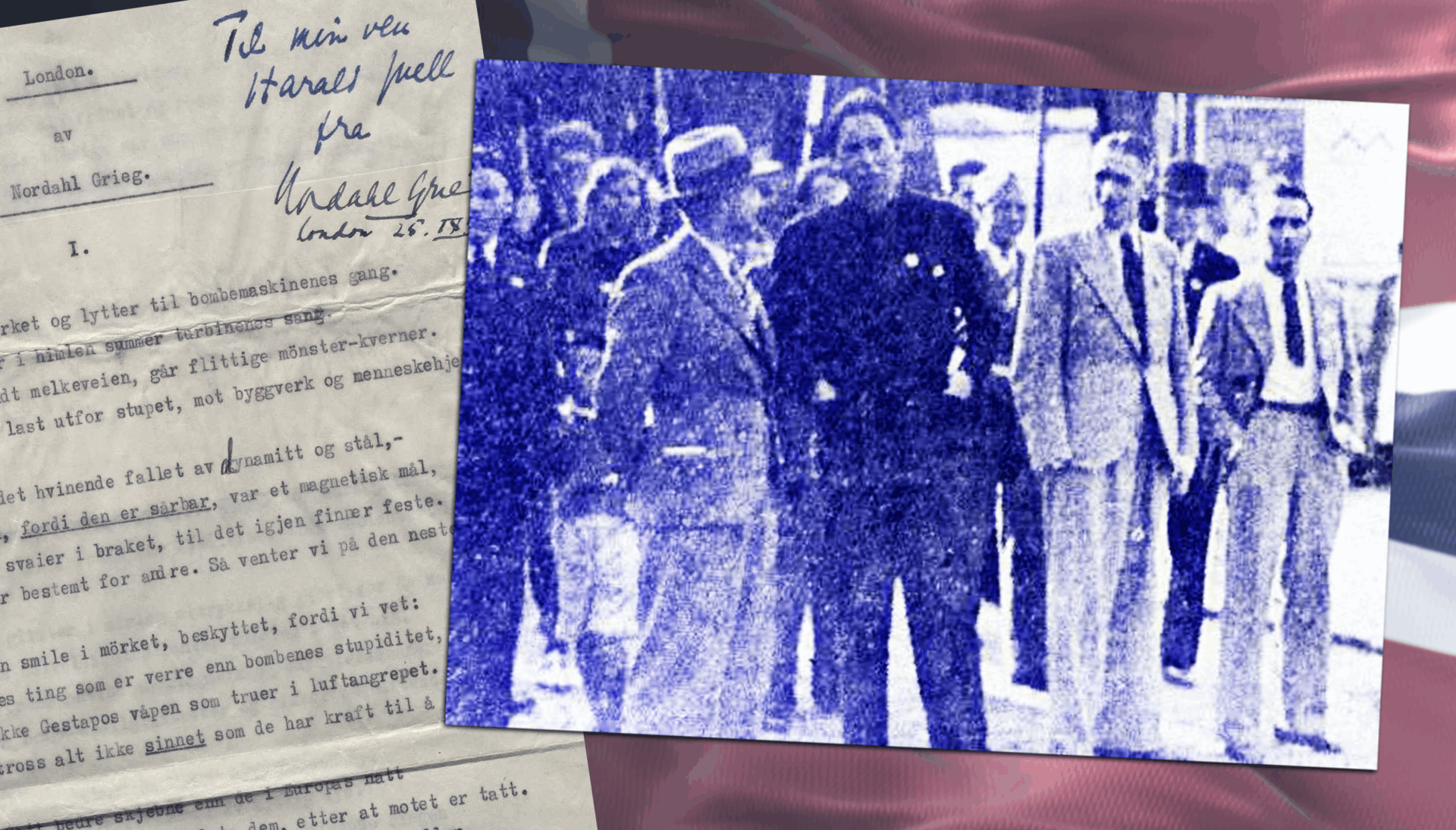 Manus till dikten London och ett foto av Nordahl Grieg taget under det kommunistiska ungdomsmötet i Göteborg 1937. Grieg bär svart kostym, bredvid honom antagligen den svenske ungkommunisten Bruno Franzen som förlorade höger hand och delar av den vänstra i Spanien. Fotograf: Aust-Agders museum och arkiv, avd. KUBEN/Okänd fotograf/Montage: Proletären