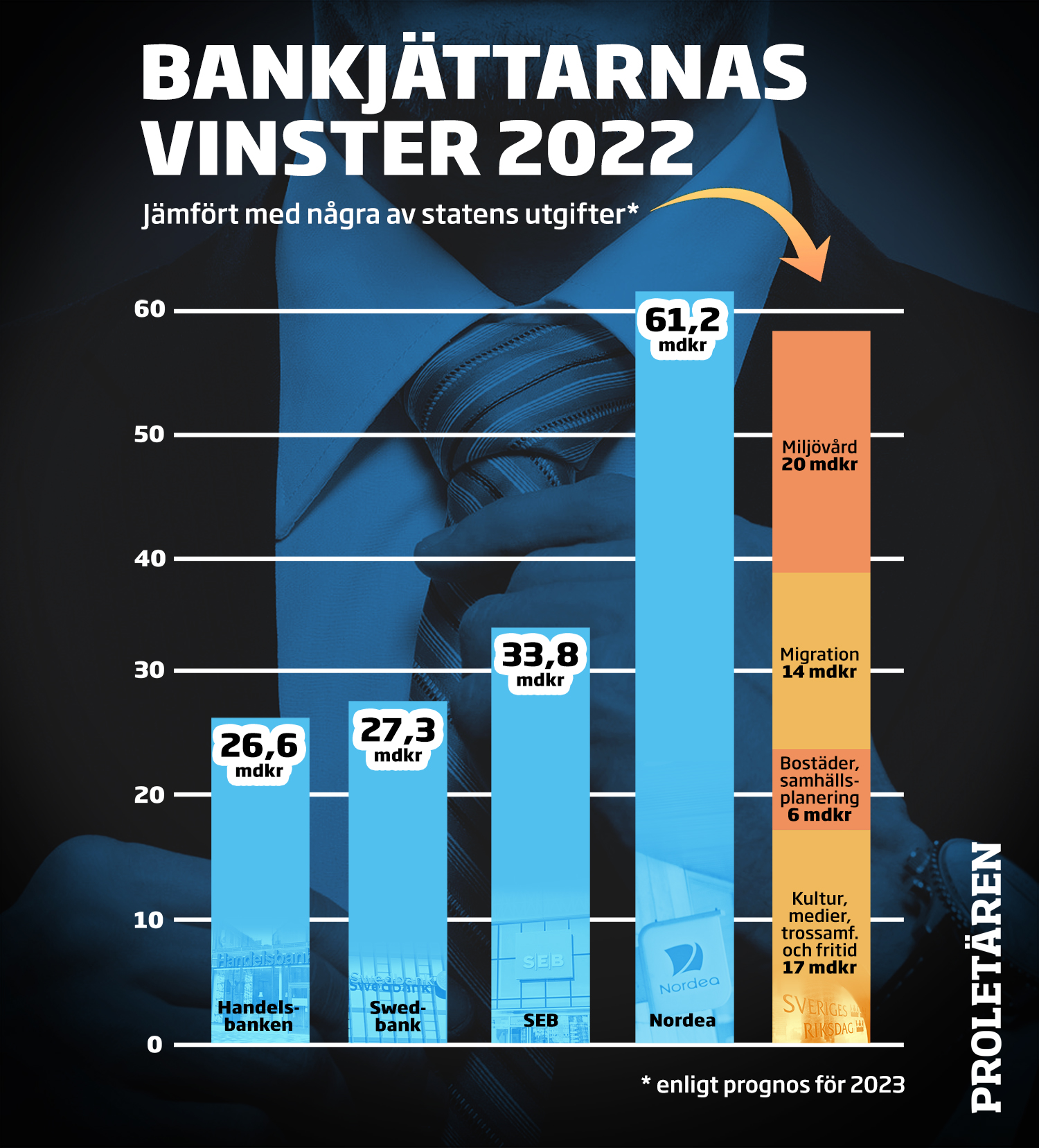 Av de nordiska storbankerna kammade Nordea hem allra fetast vinst förra året – hela 61,2 miljarder kronor. Det motsvarar ungefär 60 procent av utgiftsposten i statsbudgeten för hälsovård, sjukvård och social omsorg. Över hälften av vinsten går direkt till aktieägarna, efter att banken i sitt bokslut valde att höja utdelningen med 16 procent. Totalt blir det 33 miljarder kronor.