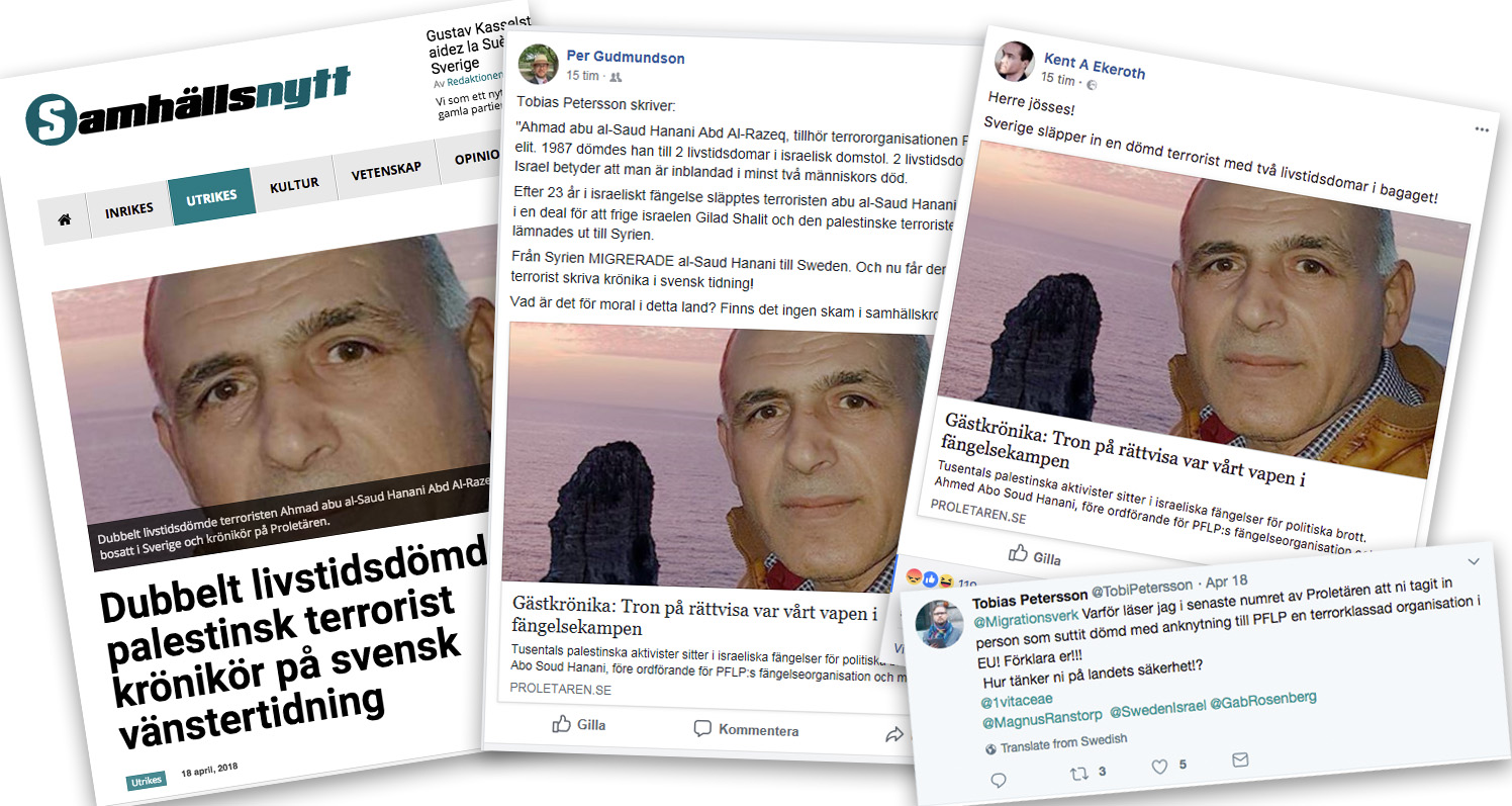 För att uppmärksamma ”Dagen för palestinska fångar” den 17 april, publicerade Proletären en krönika av den palestinska aktivisten och PFLP-medlemmen Ahmed Abo Soud Hanani, som suttit totalt 26 år i israeliskt fängelse för att ha deltagit i motståndet mot ockupationen. Krönikan har väckt ont blod hos svenska Israelvänner som inte bara ondgör sig över att Hanani sluppit ut ur fängelse – utan också för att denne nu ska ha migrerat till Sverige och fått jobb på Proletären!