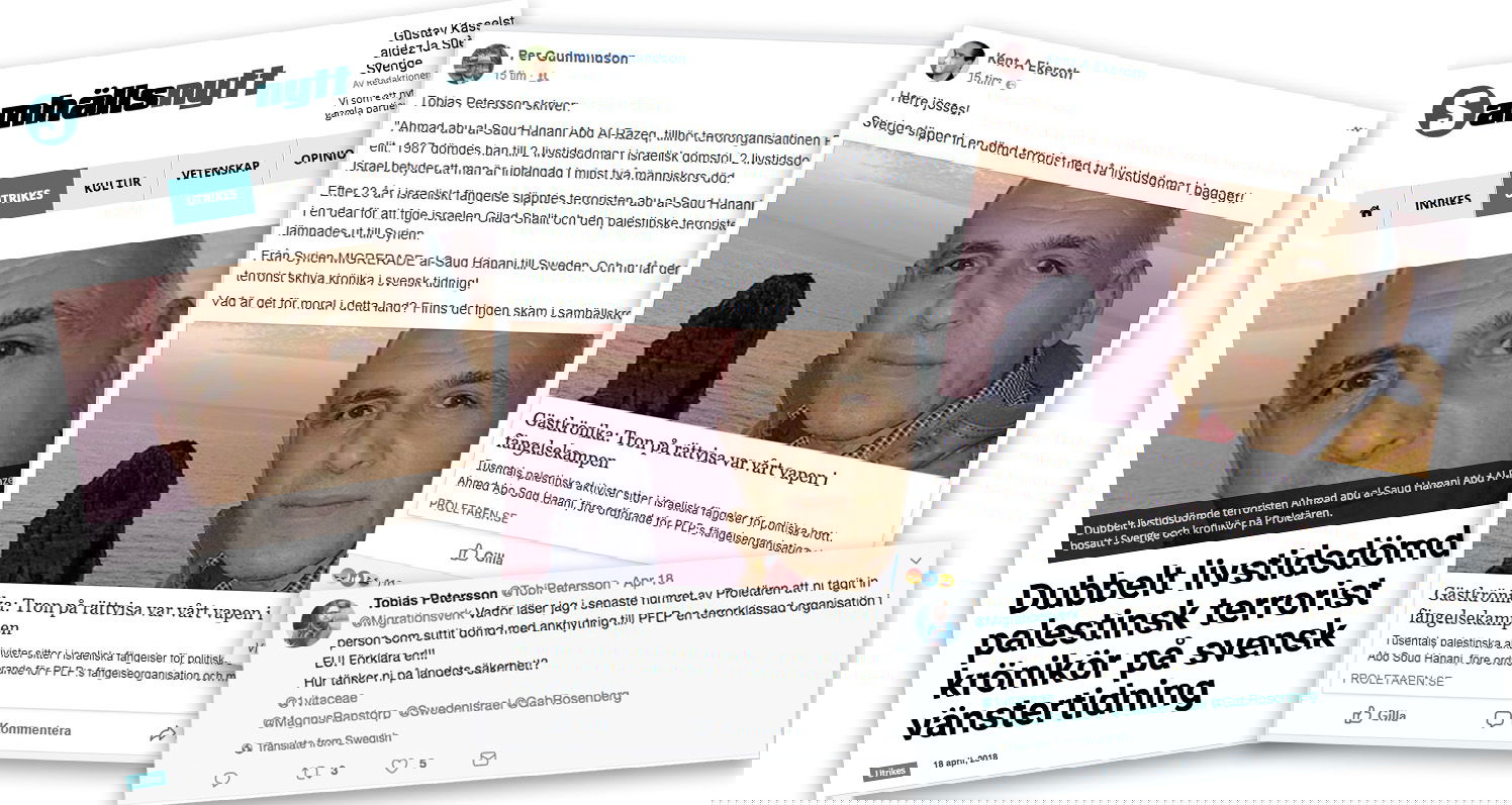 För att uppmärksamma ”Dagen för palestinska fångar” den 17 april, publicerade Proletären en krönika av den palestinska aktivisten och PFLP-medlemmen Ahmed Abo Soud Hanani, som suttit totalt 26 år i israeliskt fängelse för att ha deltagit i motståndet mot ockupationen. Krönikan har väckt ont blod hos svenska Israelvänner som inte bara ondgör sig över att Hanani sluppit ut ur fängelse – utan också för att denne nu ska ha migrerat till Sverige och fått jobb på Proletären!