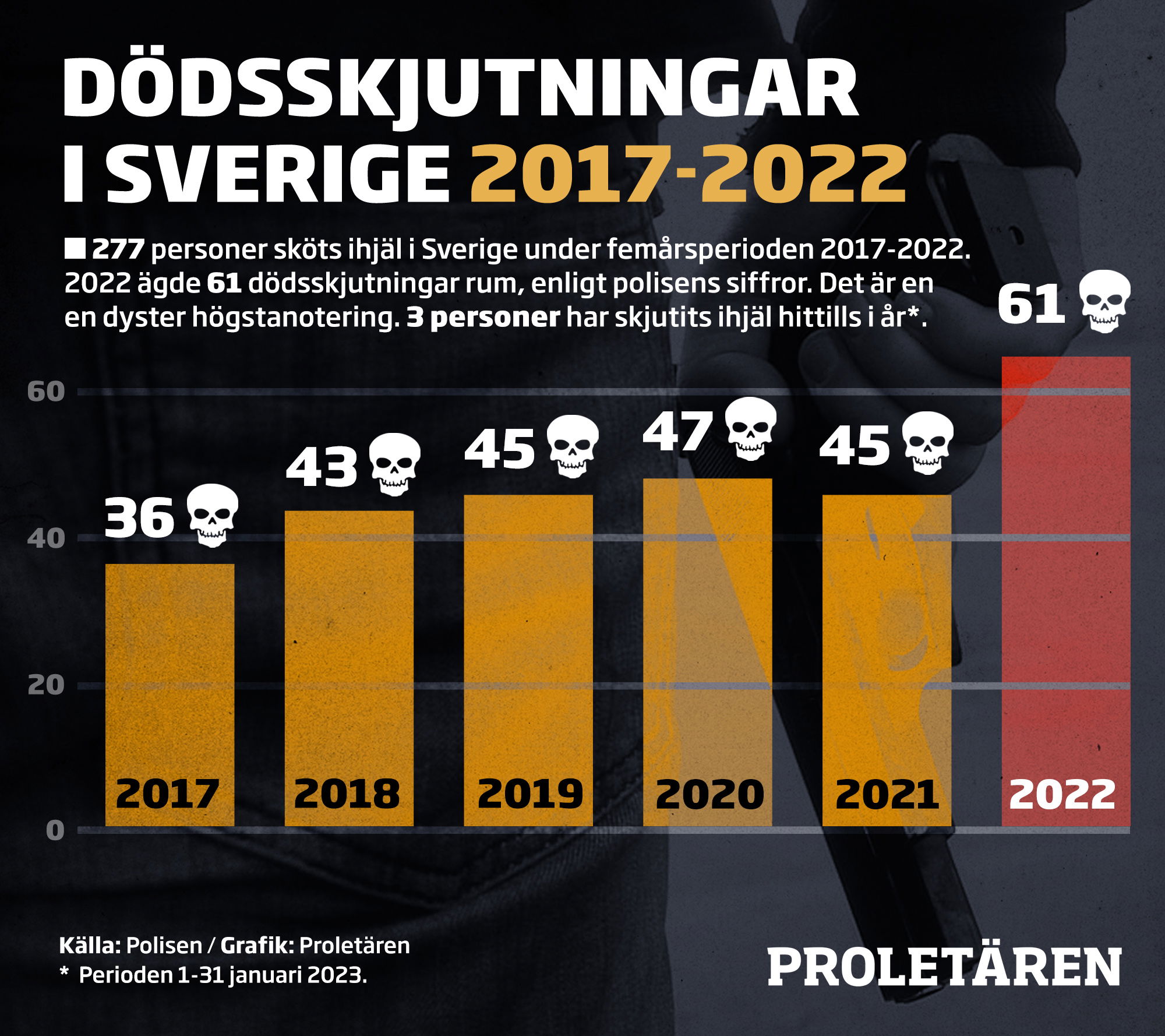 Under perioden 1 januari-7 december 2022 hade Danmark fyra fall av dödligt skjutvapenvåld, Finland hade två och Norge fyra. Det sköts alltså mer bara i Järvaområdet i Stockholm än i hela övriga Norden.