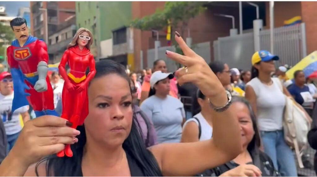 Flera kvinnor i demonstrationen höll upp skyltar med ett citat från Nicolás Maduro som yttrades under den förberedande rättegången i New York, där Venezuelas statschef samt Cilia Flores nu åtalas för bland annat ”narkotikaterrorism”.