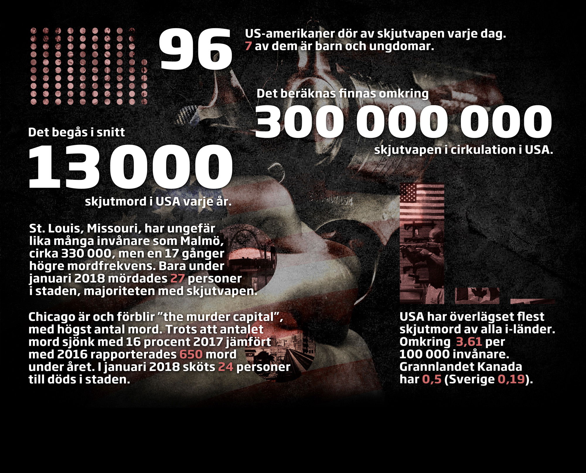 Om 2018 går i vanliga spår var de 17 offren på Marjory Stoneman Douglas High School bara en droppe i blodhavet. Enligt stiftelsen Everytown for Gun Safety Support Fund begås det ungefär 13.000 skjutmord i USA varje år, mer än i alla andra kapitalismens kärnländer tillsammans.