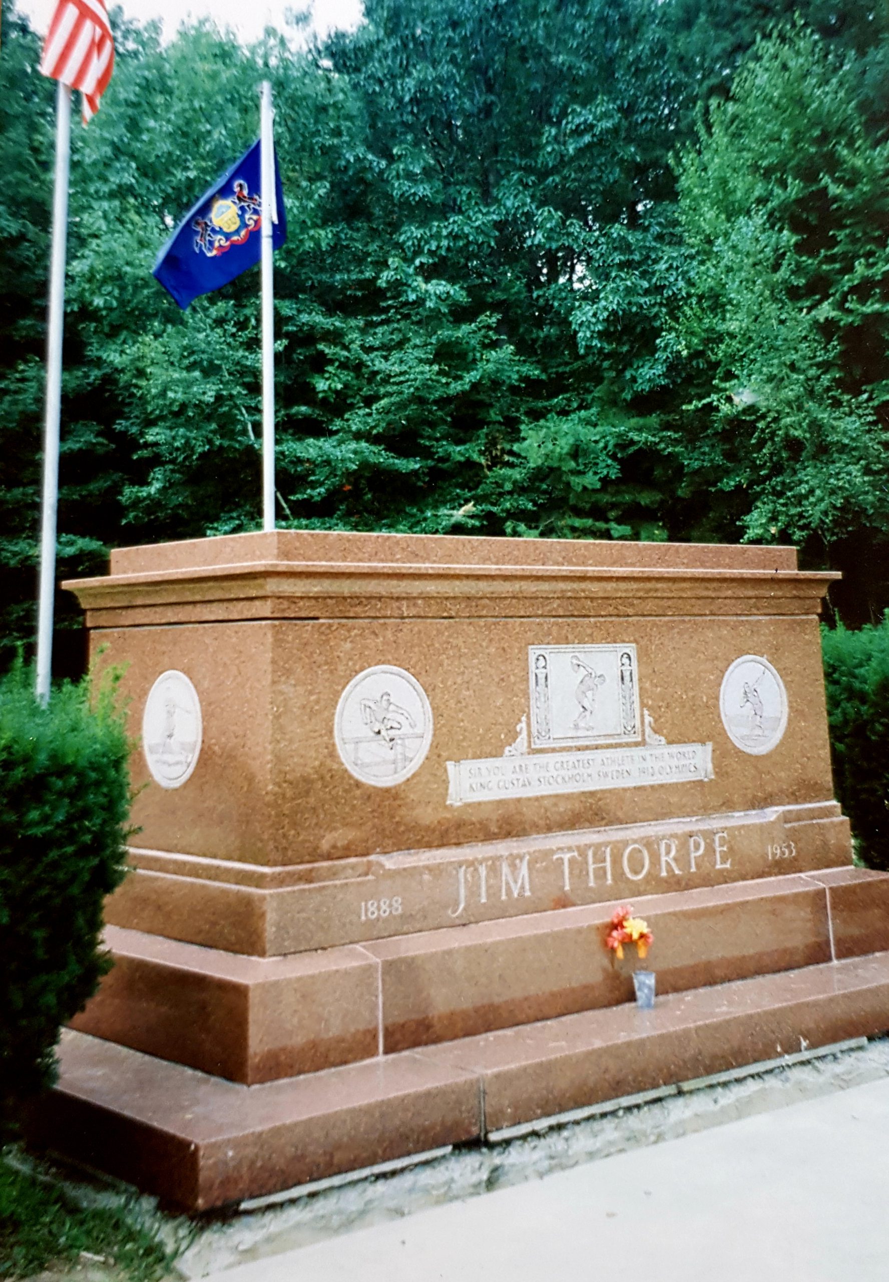 Gravmonumentet, som bilarna passerar i hög fart, bär inskriptionen ”Sir, you are the greatest athlete in the world… King Gustav, Stockholm, Sweden, 1912 Olympics”.