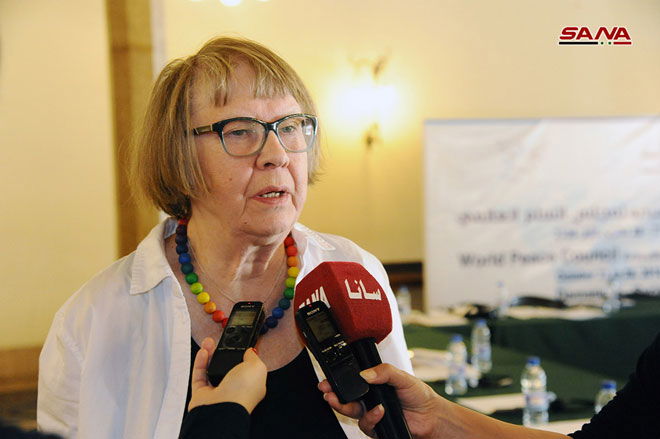 Ett 50-tal delegater och inbjudna talare från totalt 28 länder deltog i slutet av oktober på Världsfredsrådets verkställande kommittés möte i Damaskus, Syrien. Enda svensk deltagare var fredsaktivisten Agneta Norberg från Stockholm, som var inbjuden för att tala om Norden och Nato.