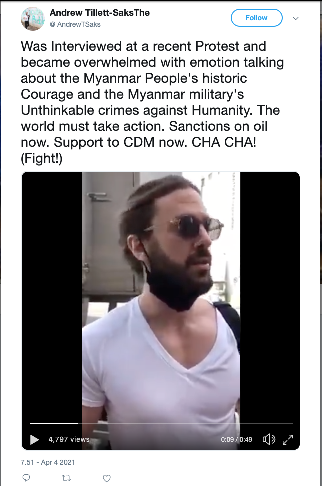 Andrew Tillett-Saks är mycket aktiv i lobbyarbetet för fackföreningarna som strejkar mot kuppen, och har samtidigt öppet kallat på en utländsk intervention. I en nu borttagen tweet från den 4 april, som fortfarande går att googla fram, säger han i en videosnutt att: ”Om USA står med demokrati – och detta är det mest svartvita, tydliga fall jag någonsin sett av demokrati mot tyranni, och frihet mot diktatur – bör USA intervenera på vilket sätt som helst de fysiskt kan, med militären, ge vapen till folket, gör vad som helst som de måste göra för att stå med folket.”