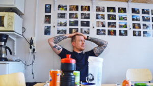Foton på arbetskamrater blev vernissage i byggbarack