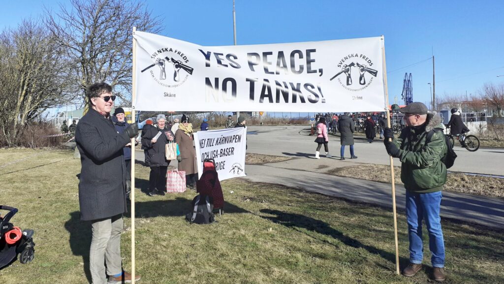 Ett dussin fredsaktivister samlades I Malmö hamn vid det franska atomdrivna hangarfartyget som ligger förtöjt där. Flygblad för fred delades ut till de massor som kommit för att beskåda det.
